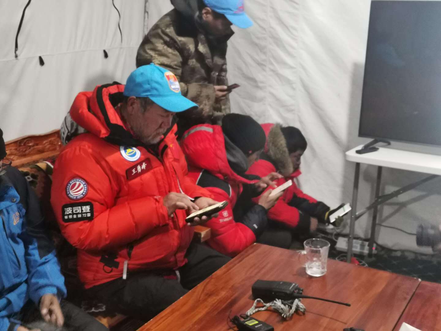 中國登山隊隊長王勇峰正在與準備沖頂的隊員進行視頻聯絡。人民日報記者袁泉、谷業凱攝