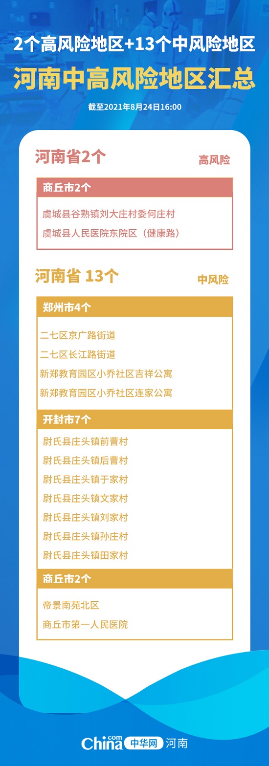 一、自2021年8月24日18時起,將二七區建中街街道西福民小區、二七區福華街街道鐵道京廣家園、二七區福華街街道油漆廠家屬院(132號院)由中風險地區調整為低風險地區。