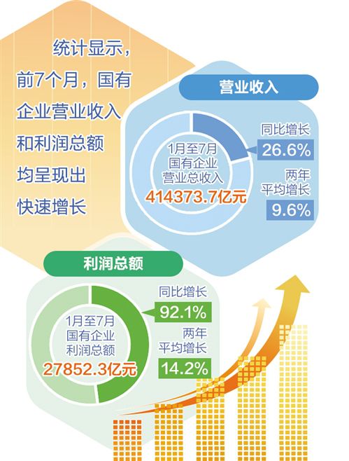 統(tǒng)計顯示,前7個月,國有企業(yè)營業(yè)收入和利潤總額均呈現(xiàn)出快速增長。在營業(yè)收入方面,1月至7月,國有企業(yè)營業(yè)總收入414373.7億元,同比增長26.6%,兩年平均增長9.6%。其中中央企業(yè)232755.9億元,同比增長24.9%,兩年平均增長8.0%;地方國有企業(yè)181617.8億元,同比增長28.9%,兩年平均增長11.8%。