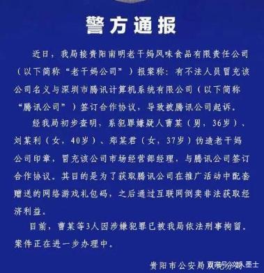 7月1日,經調查,貴陽市公安局雙龍分局做出了解釋,其發布通報稱在騰訊和老干媽事件當中,初步調查結果顯示是三個人偽造了老干媽公章并冒充老干媽市場經營部經理,對騰訊進行了詐騙,目前詐騙三人已經被刑拘。