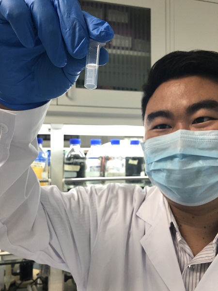 2021年8月30日,中國科學(xué)院天津工業(yè)生物技術(shù)研究所蔡韜副研究員在實(shí)驗(yàn)室展示人工合成淀粉樣品。中國科學(xué)院科技攝影聯(lián)盟供圖