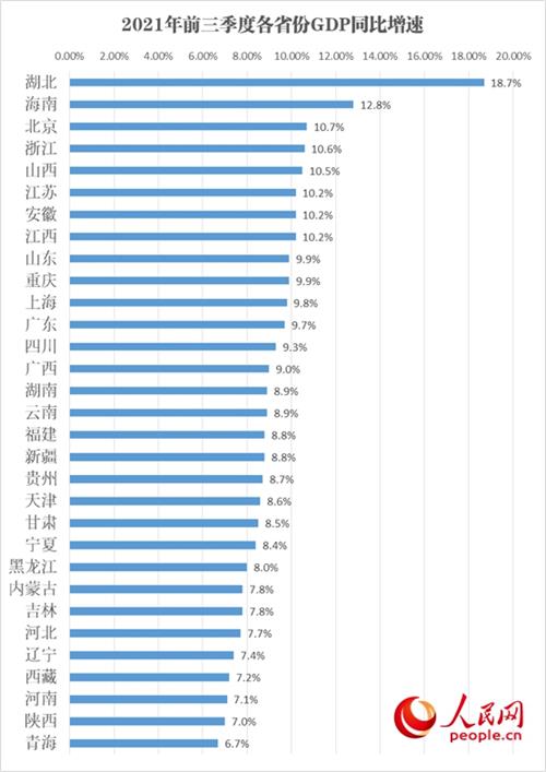 其中,湖北因低基數效應以18.7%的增速遙遙領先,經濟持續復蘇,發展韌性持續顯現。海南增速12.8%緊隨其后,北京增速10.7%居第三。