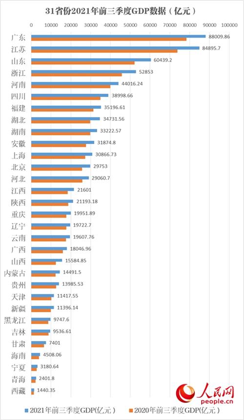 31省份2021年前三季度與2020年前三季度GDP對比圖。數據來源:各地統計局