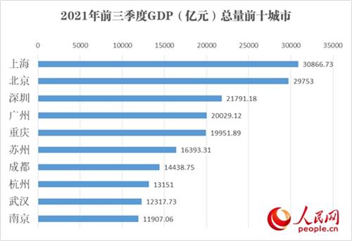 2021年前三季度GDP總量前十城市。數據來源:各地統計局