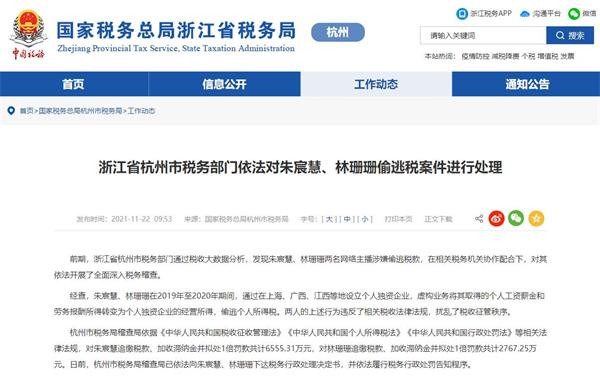 人民網北京11月22日電 (記者王震)據國家稅務總局杭州市稅務局網站22日消息,浙江省杭州市稅務部門依法對(微博ID:雪梨Cherie)、林珊珊(微博ID:林珊珊_Sunny)偷逃稅案件進行處理。網絡主播朱宸慧、林珊珊因偷逃稅款,將被依法追繳稅款、加收滯納金并處罰款分別計6555.31萬元和2767.25萬元。