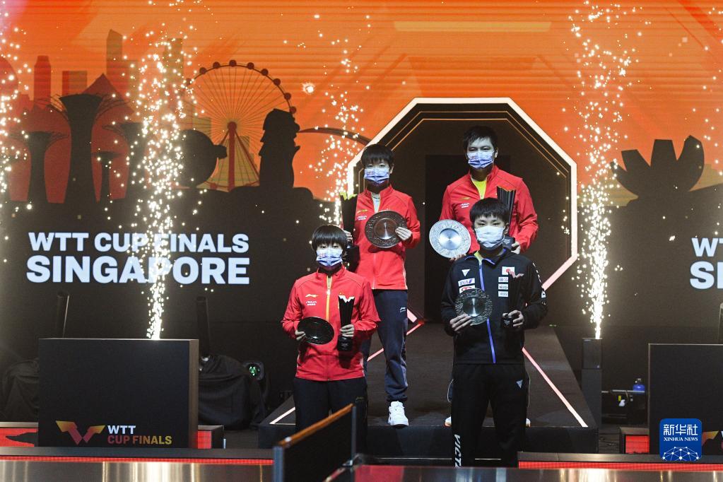12月7日,女單冠軍孫穎莎(上排左)、女單亞軍王藝迪(下排左)、男單冠軍樊振東(上排右)與男單亞軍日本選手張本智和在頒獎儀式上。