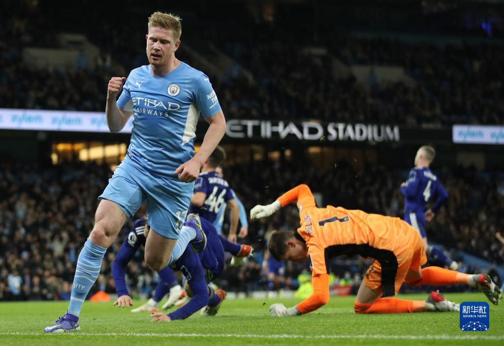 12月14日,曼城隊球員德布勞內(左)打進球隊第三粒進球后慶祝。