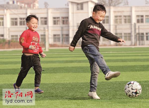 在洛寧縣小界鄉有幾個小朋友正在足球場上踢足球。該縣先后修建了55個人造足球場,大部分學校開設有足球課。