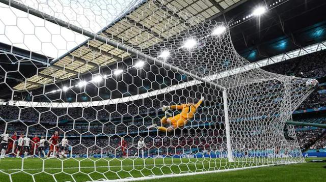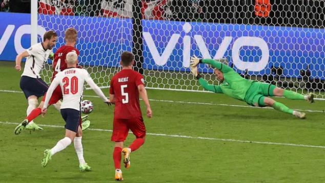 也許丹麥人認為“門神”小舒梅切爾會讓他們在點球大戰中更有勝算,但加時賽中攻勢不減的英格蘭隊沒有給他們機會。斯特林突入禁區造成對手犯規,凱恩隨后主罰的點球雖然被小舒梅切爾撲出,但英格蘭隊隊長緊接著補射中的。第104分鐘,英格蘭隊終于2:1實現反超。