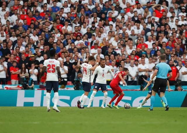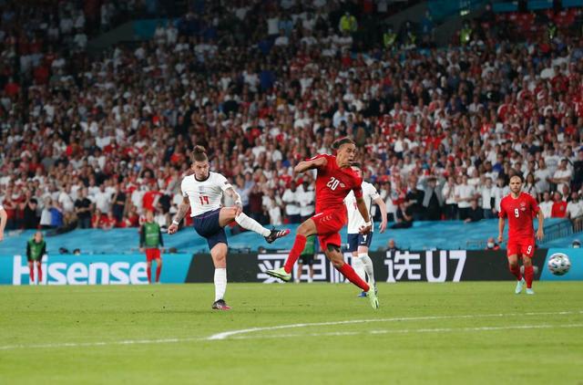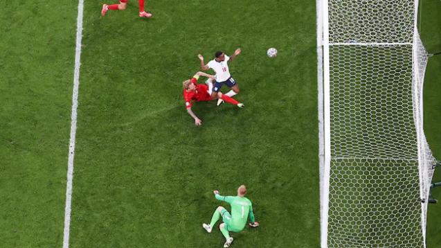 下半場一開場,英格蘭隊又是圍攻之勢,但馬奎爾的頭球、芒特的兜射都被小舒梅切爾神勇撲出。丹麥隊體力下降明顯,一旦拿球也不再急于突破。