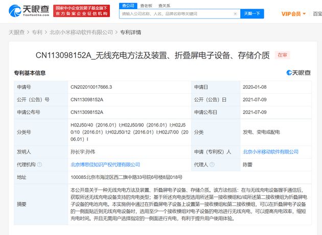 天眼查App顯示,7月9日,北京小米移動軟件有限公司公開一項名為“無線充電方法及裝置、折疊屏電子設備、存儲介質”的專利,公開號CN113098152A,申請日為2020年1月。