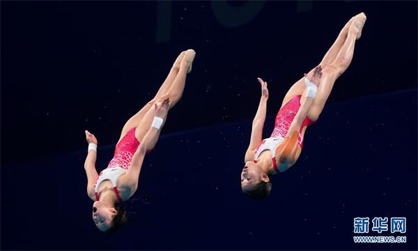 7月27日,中國(guó)選手陳芋汐/張家齊在比賽中。當(dāng)日,東京奧運(yùn)會(huì)跳水女子雙人十米跳臺(tái)決賽在東京水上運(yùn)動(dòng)中心舉行。新華社記者 許暢 攝